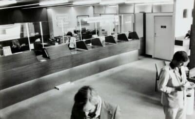 Black-and-white photo of a bank interior with teller counters and customers being served.
